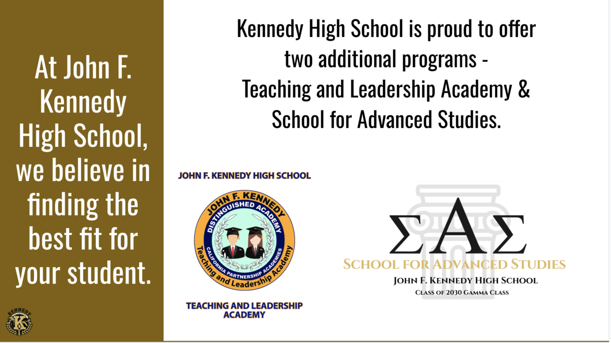 SAS & Teaching and Leadership Academy Information Video SAS and Teaching and Learning Academy Presentation Attached Files TA and SAS Presentation.pdf Kennedy High School Programs Overview (1).mp4